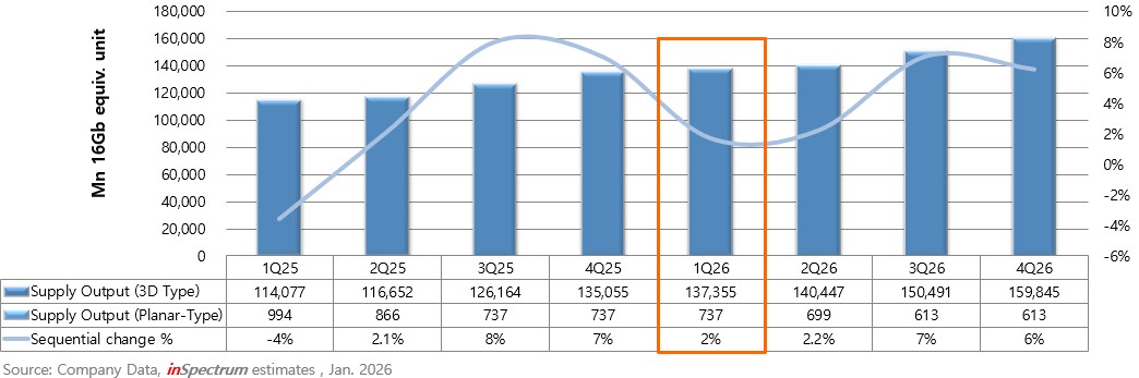 在人工智能和数据中心增长的推动下,NAND Flash需求急剧转向高容量的企业SSD,促使3D NAND产量稳步上升,平面NAND产量下降,昭示着供应结构正为适应不断变化的市场需求而实现转型。